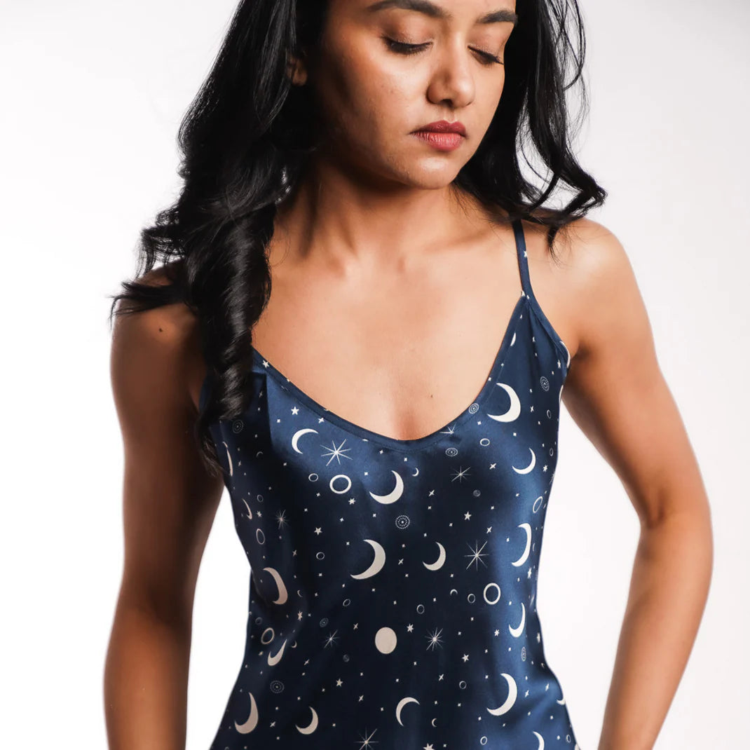 Crafted from the finest mulberry silk, this silk drapes with the natural lustre that catches the light like moonlit water. Soft against the skin and timeless in silhouette, it transforms the act of rest into an intimate indulgence.